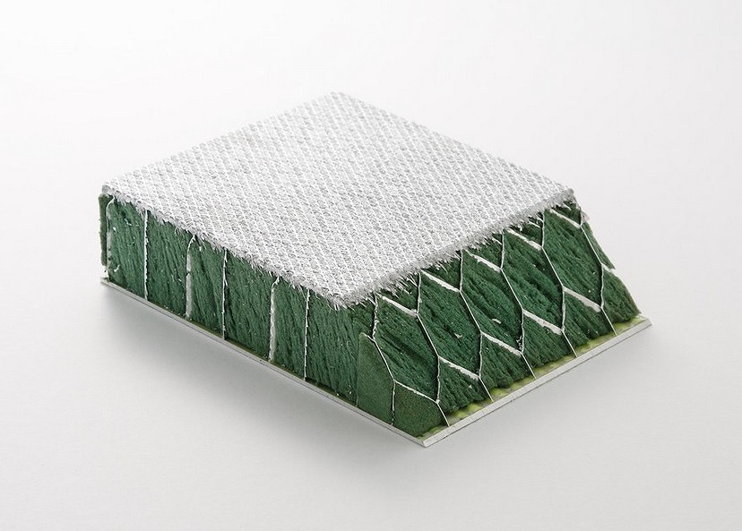 従来の「一人静」は、樹脂含浸ペーパーのハニカム材にフェノール樹脂の発泡剤を充てんし、内面をアルミ繊維、外面をアルミ板ではさんだ構造。断熱性能が高く熱がこもってしまうため、稼働時に発熱する機械類の防音に適合しにくかった。