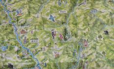 奥相模の豊かな自然、歴史伝承などを描いた「奥さがみ道志・桂川 散策絵図」を観光振興に尽力する相模原商工会議所副会頭で北辰企業社長の原幹朗さんが、構想から3年ほどかけて2024年に自費で企画制作した。都県や市町村を超えた広域観光の実現を目指した鳥観図で、さまざまな歴史伝承が描かれている。市民が地元の