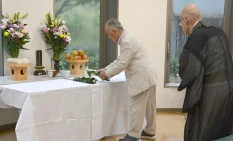 相模ダムの建設で相模湖に沈んだ旧日連村勝瀬集落の居住者の子孫らでつくる居住者会の集いと慰霊祭が5日、県立相模湖交流センター(相模原市緑区与瀬)で行われた。同集落の近くにあった凰勝寺跡の「勝瀬ふる里の碑」(日連)で湖底に残る先祖の墓を供養するのが通例だが、ことしは関東地方に接近していた台風15号を懸